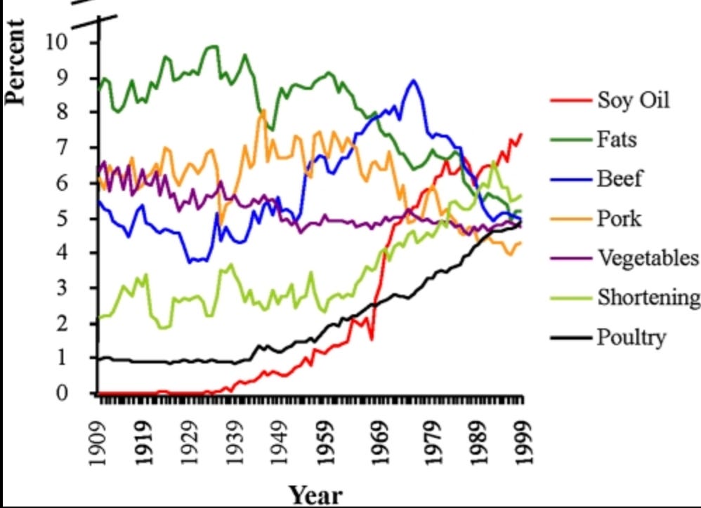 Soy Oil is the Largest Source of Calories in the US: Another under discussed aspect of obesity is the rise of soybeans in the US diet. And it practically didn’t exist 100 years ago.