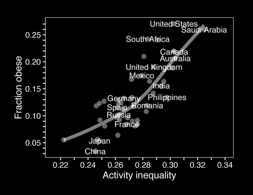 for sharing these!Activity Inequality Predicts Obesity: A Stanford study shows individuals in the five countries with highest activity inequality are 196% more likely to be obese than individuals from the 5 countries with lowest activity inequality.