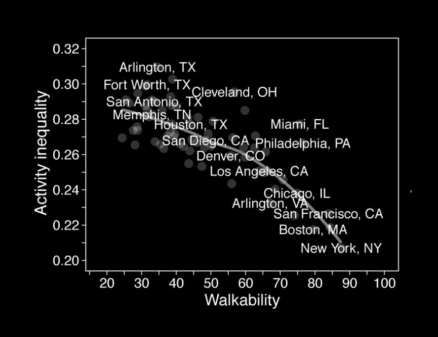 What impacts “activity inequality”? The built environment, specifically city walkability. This shows up with higher walkability scores associated with lower levels of activity inequality across 69 US cities.