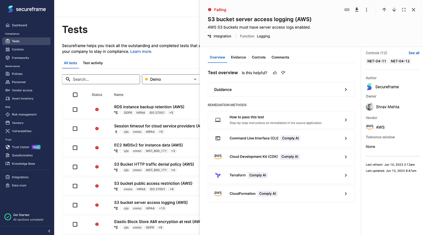 Using infrastructure as code (IaC), Comply AI works in real-time to quickly generate initial remediation guidance as code so you can easily correct underlying configuration or other issues causing the control failure in your cloud environment.