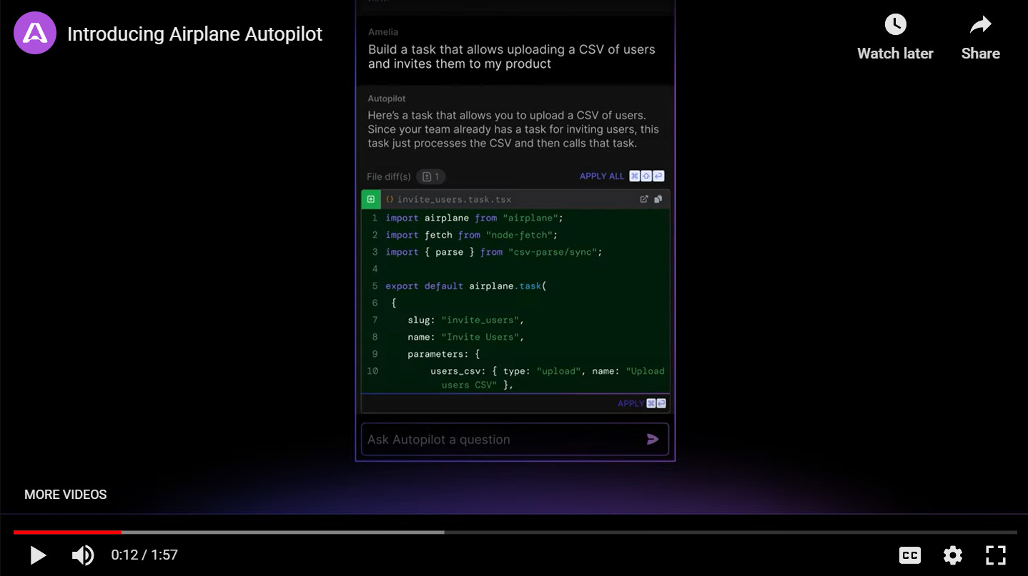 Airplane Autipilot: A new AI-optimized pair programmer that embeds inside the Airplane workspace. It answers questions, explains code, helps debug, provides dynamic suggestions, and overall helps build better software. This is also one of the cleanest product trailers you’ll ever watch.