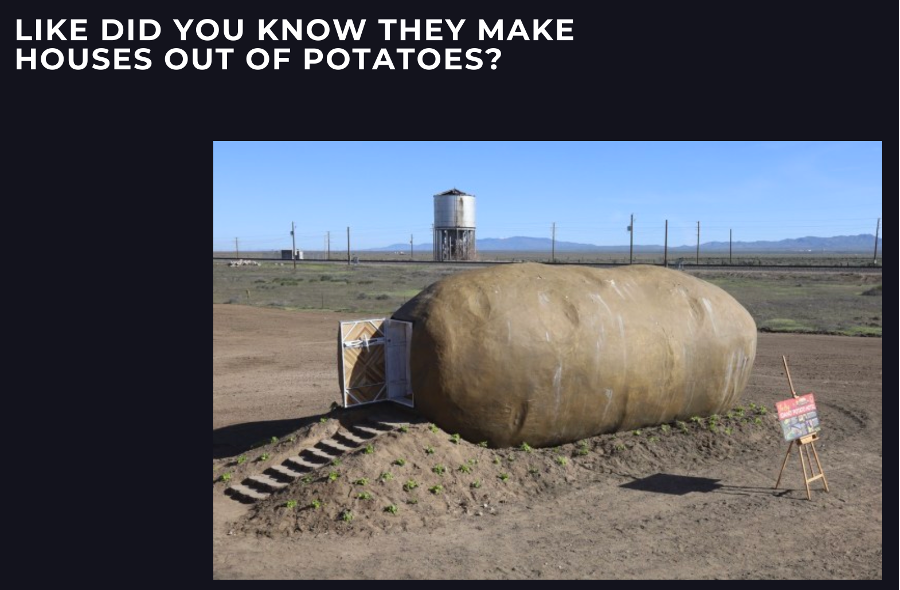 So the potato was there because my argument was, “This has been tried a bunch of times. Here are the examples. Here's the competition. I can find more efficient ways to light money on fire. Did you know they made house out of potatoes?” and yes, there was a picture of it as well.