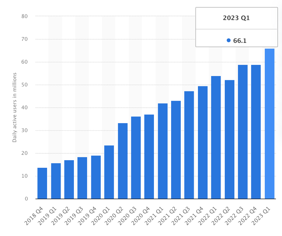Daily active users (DAU) of Roblox games worldwide from 4th quarter 2018 to 1st quarter 2023. Source.