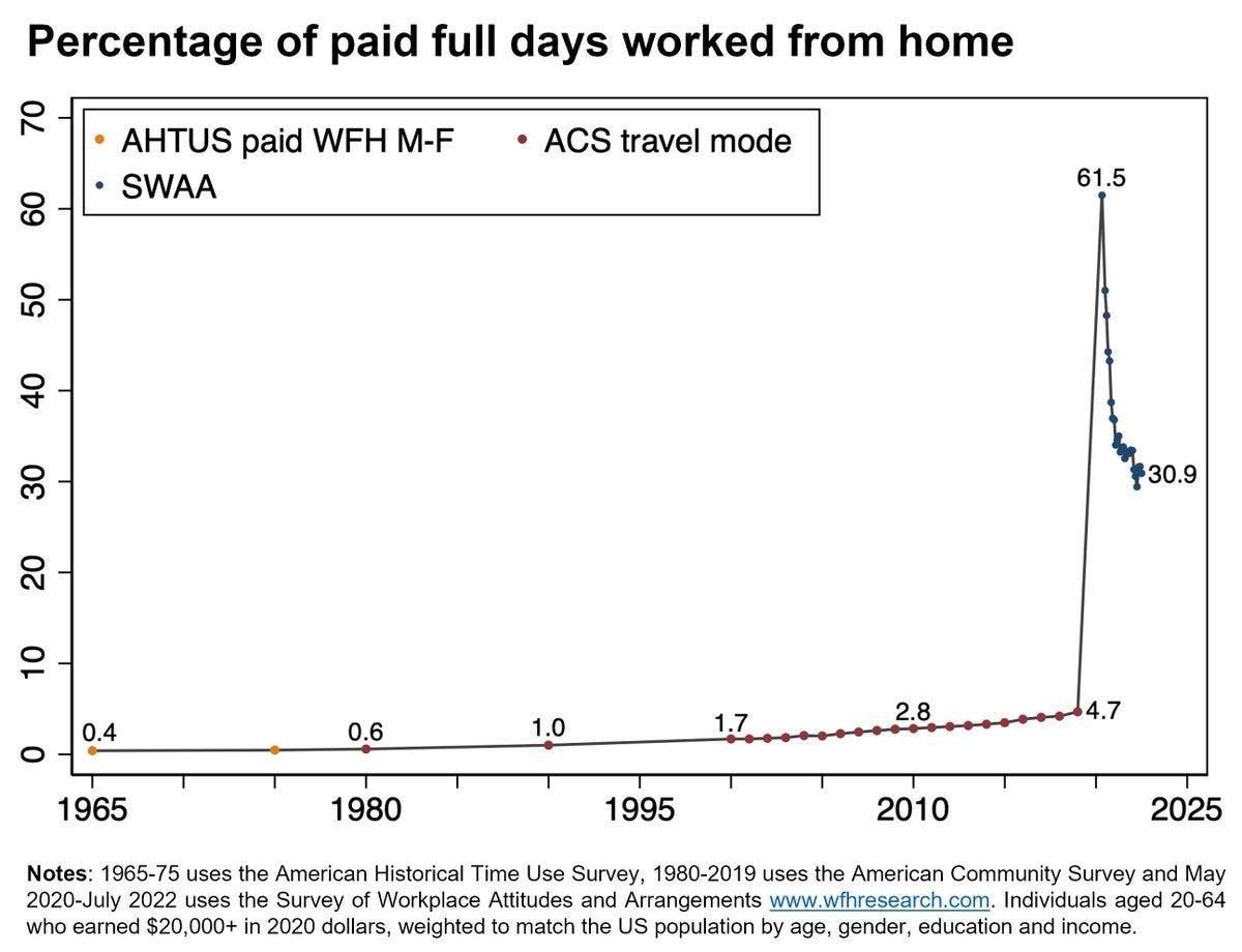 Americans are working 31% of paid days from home,Ā up from 4.7% in 2020. Working from home is 30-40% more commonĀ in the Top 10 largest US cities compared to smaller cities and towns, and the gap is widening. More from WFH Research.