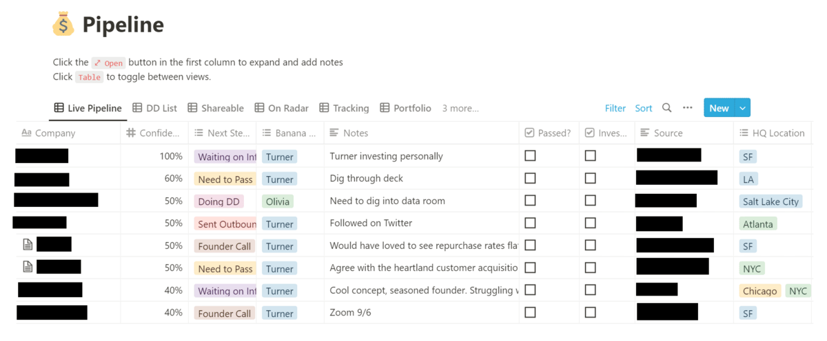 Not quite as powerful as Shuffles, Notion is how we run both Banana Cap and The Split. Its an all-in-one collaborative workspace that combines notes, docs, project management, wikis (and in our case an Investment Pipeline below) into one, easily customizable tool.